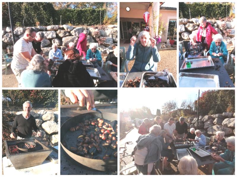 Résidents, familles, aides-soignantes, aides hôtelières, toutes les personnes présentes ont pu prendre part à la décortication pour libérer les fruits de leur coque et se délecter d’un goûter aux succulentes saveurs automnales.
