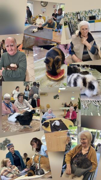 Comme il en est de coutume dans notre EHPAD, nos ainés étaient conviés à se rendre autours des tables de la grande salle de la "Pinède". Tout y était installé pour laisser déambuler nos amis les bêtes de table en table et de mains en mains. De nombreuses caresses ont été distribuées provoquant du réconfort et d’innombrables sourires chez nos séniors.